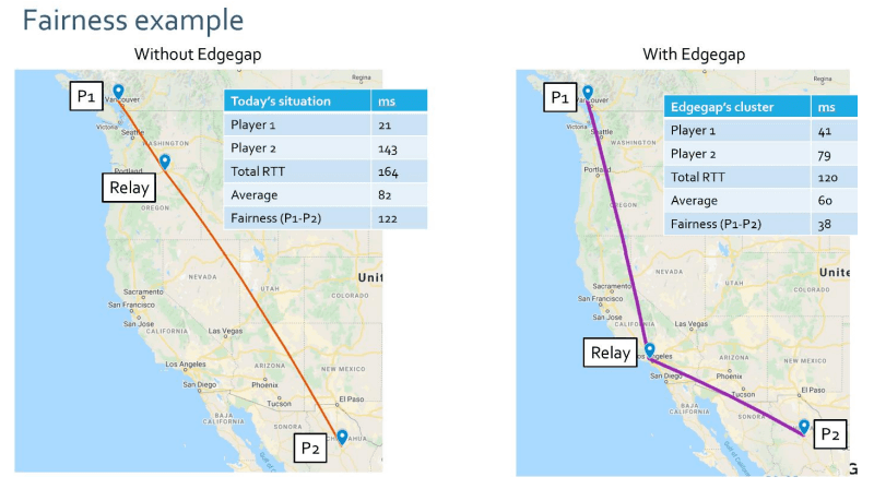 Here’s one example of a match between players on the West Coast. In the original game, the game studio chose Washington State for the relay server. Edgegap suggested using LA and reduced the average latency, RTT gap, and lag and made this a much fairer match for both players.